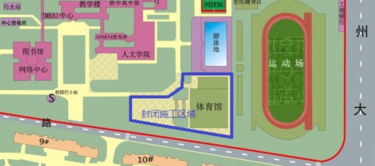 根据学校相关工作安排,需对南区体育馆进行维修,计划于2025年7月18日至2025年12月30日对其周边道路临时封闭,同时体育馆内所有教学、办公、活动等均需暂停,同时需做好门窗及物品封存工作,非施工人员需全部撤离(具体封闭范围见附图),过往车辆及人员请绕行,给广大师生带来的不便,敬请谅解。